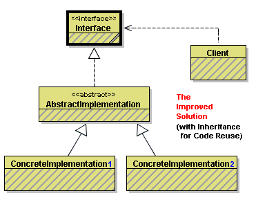(Gang of Four) When we attempt to keep all the references maintained by a concrete class as Interfaces, the Interface Implementation becomes a big issue. Since Interfaces just define the method signature and not the implementation in itself, code reuse suffers, as every concrete class that implement these interfaces has to rewrite all the code, even if most of it are exactly similar. Implementation Inheritance is ideal for this not-so-elite activity of Code Reuse. One good pattern that can be employed would be to define an abstract class, with most of the common code going into it, and what is specific to various individual implementation could be an abstract method, which can latter be overridden and implemented by the derived classes. This is Template Method Pattern.