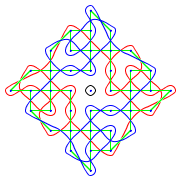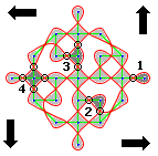 The trick is to use the symmetry of the kolam. The typical symmetry used is the cyclic symmetry, as shown in the above figure. This is also the most complex and the most impressive one, apart from being the most common (the others are reflection symmetry between the halves). This reduces the problem of remembering the whole kolam, to one of remembering just one quarter of it. Of course, nothing stops us from creating a completely asymmetrical one, but I haven’t seen it in daily use (maybe I should explore more of that, now that it is easy with this program).
