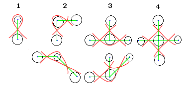 If you see the sample kolams above, and observe the curve in the vicinity of the dots, you can see that it follows intuitive and simple patterns. I’ve enumerated these crossovers for vertices of various degrees. This picture was created by enlarging the kolam and rubbing out the irrelevant parts. Note particularly that a dot with a given degree can manifest in various angles. For example, see the difference in curve form for the dot of degree two. This seemingly insignificant point can confuse a novice’s mind. When you see the link of bubbles with these crossovers, the curve’s path should be pretty clear. But again, how to draw the curve in one single flow, without resorting to modeling the physical bubbles?